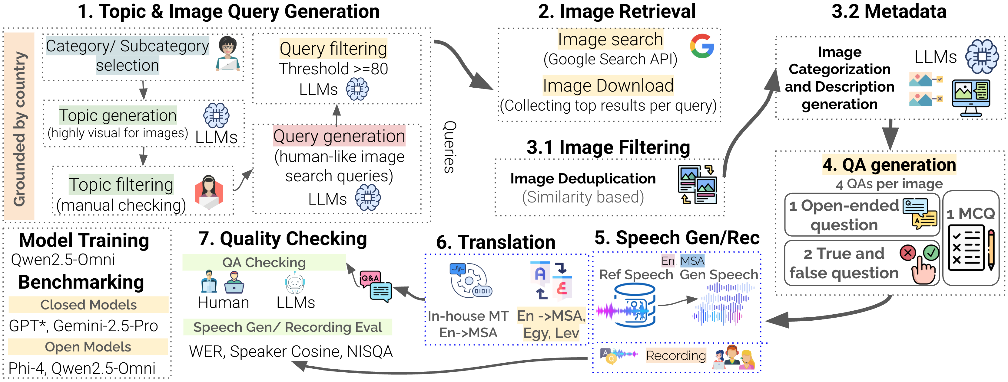 EverydayMMQA targets a gap in multimodal evaluation: many current models perform well on standard visual question answering but still miss culturally grounded, everyday knowledge, especially in underrepresented languages. The framework organizes the full data creation pipeline, from culturally grounded topic and query generation through country-localized image retrieval, filtering, QA generation, speech generation, translation, and quality checking. Using this pipeline, the paper develops OASIS as a benchmark and training resource for spoken visual QA.