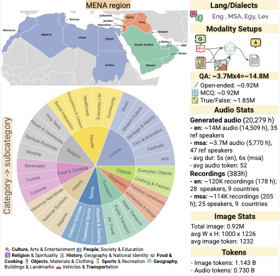 OASIS integrates speech, images, and text to support culturally grounded evaluation beyond simple object recognition. The resource spans English, Modern Standard Arabic, Egyptian Arabic, and Levantine Arabic across a balanced set of country-specific contexts.