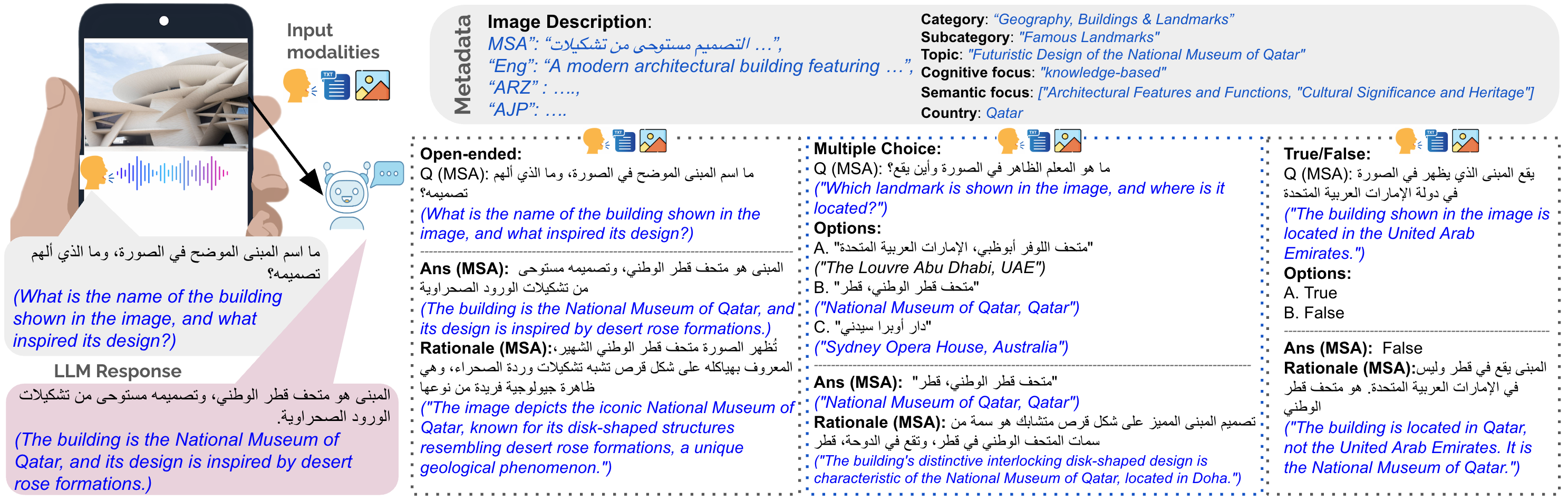 Each image is paired with four QA instances: one open-ended question, one multiple-choice question, and two true-false questions. The benchmark supports four main input settings for evaluation.